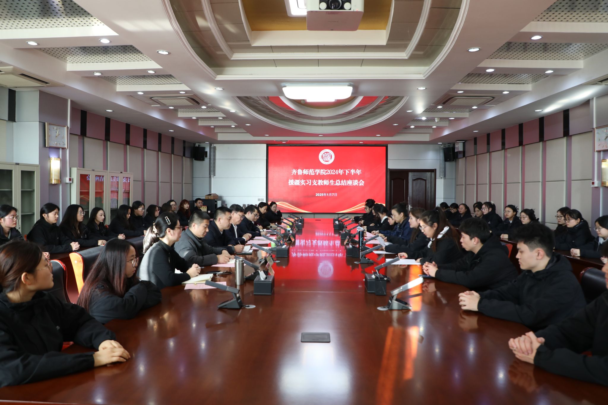1月7日清晨,齐鲁师范学院 2024 年下半年暨第六批援疆实习支教师生圆满结束支教任务返济。当日下午,学校于章丘校区第一会议室举行援疆实习支教工作总结座谈会,党委书记林松柏出席会议并与师生亲切交流。学生工作部、团委、教务处及外国语学院负责人参加座谈会。会议由党委委员、副校长孙正主持。