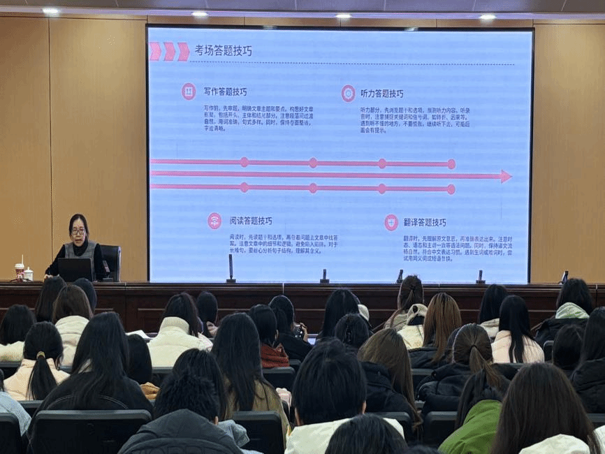 李燕从大学4年不同阶段的英语学习规划的重要性入题,凭借多年的教学和考试命题阅卷经验,特别对四六级、考研英语等考试的题型分析和备考给出了建议,详细解读了学习过程中可能遇到的各种问题,并针对性地提出解决策略。李燕表示,英语具有通用性,掌握好英语这一语言工具的使用能够助力大家获取多角度的学习资源和拥有更多意想不到的机会。她鼓励大家根据大学的不同阶段制定专属的学习计划,学会循序渐进、系统规划,切实打牢自己的英语基础与应用功底。同时,她重点讲解了英语四六级考试,从写作、阅读、翻译和听力四类题型出发,分别为同学们讲解了复习方法以及考场答题技巧,倡导同学们要多利用原声影视、英文歌曲、在线课程等资源,营造浓厚英语学习氛围,塑造自己的语言环境与英语习惯,从词汇积累、语法掌握、口语表达、写作训练等多个层面立体化构建英语学习大厦。