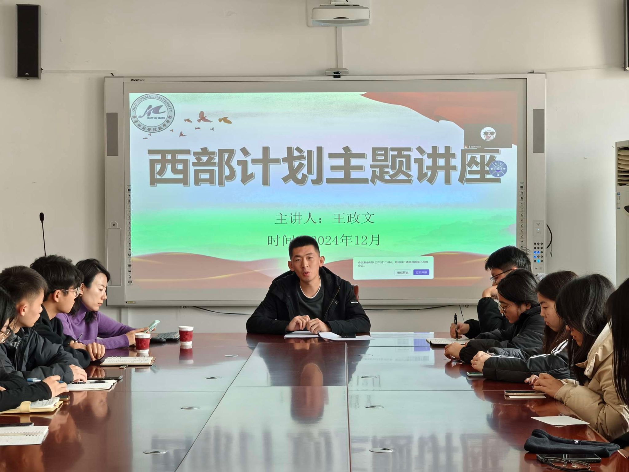 12月18日,学院团总支举办西部计划座谈会。辅导员王政文担任主讲人,学院党委副书记李钰茜以及各班学生代表参与,共同开启了一场关于西部计划的深入探讨。会议伊始,王政文详细地阐述了西部计划的背景、意义、报名和选拔的具体详情,并为同学们答疑解惑,针对就业前景、补贴待遇等关切问题一一耐心解答。李钰茜也发表了深刻见解,指出新时代青年应担当起时代赋予的责任,积极响应国家号召参与西部计划,这不仅是个人成长的宝贵机遇,更是为国家发展贡献力量的重要途径。