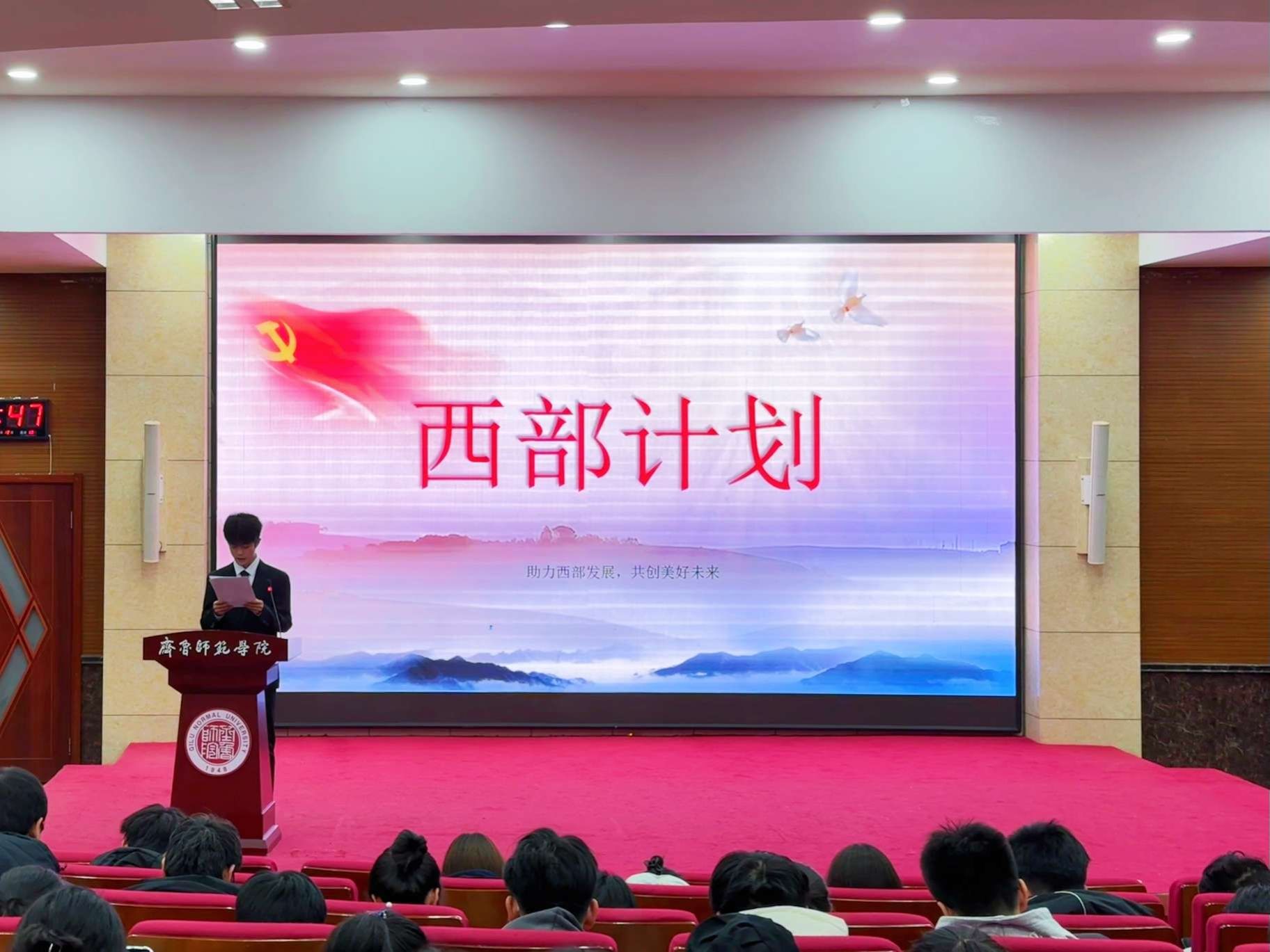 12月22日,学院举办西部计划微视频宣讲活动。2024级全体同学踊跃参与,共同见证了一场视觉与心灵的盛宴。活动中展示的微视频,生动地描绘了西部大地的辽阔壮美与深厚底蕴,聚焦于那些在西部默默奉献的志愿者们的平凡而伟大的身影。通过精美的画面与真挚的情感传递,同学们仿佛亲身踏足那片土地,不仅领略到西部自然风光的雄浑魅力,更深刻体悟到志愿者们无私奉献与担当精神的崇高伟大。